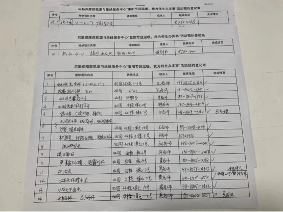 活动期间,工作人员耐心的向退休教职工介绍活动内容,询问了他们亟待解决的难题,详细登记并按项目及时分配给维修的工作人员,以便更好更快的解决问题。