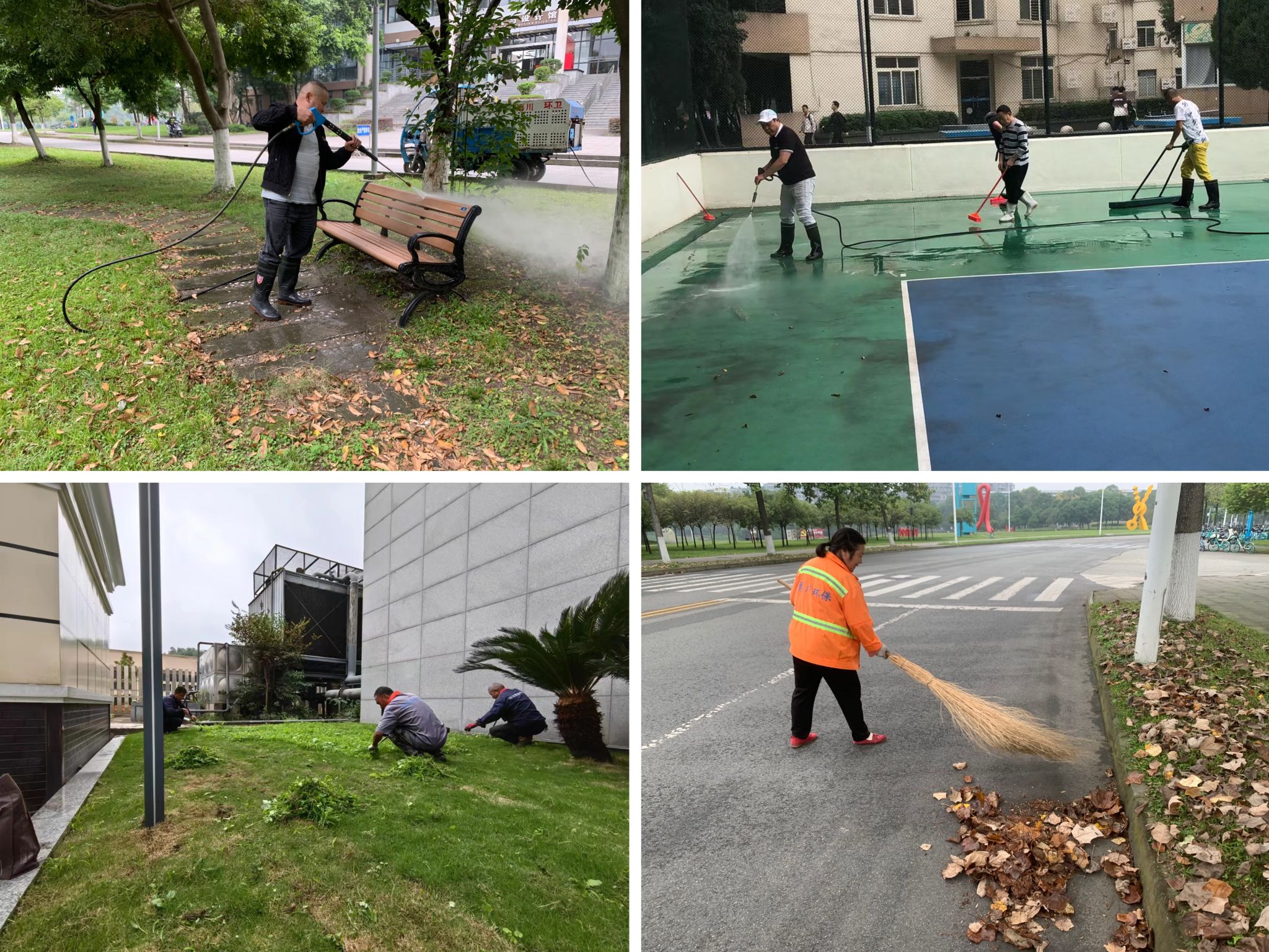 环境整治是后勤物业人守护美丽校园的另一个重要职责。他们定期对校园进行清洁和美化,清除杂草,清运垃圾……保持校园的干净整洁。剪枝工人不畏艰辛,在高空作业车的帮助下,修剪被狂风吹断的树枝,排除断枝伤人的安全隐患;绿化工人推着割草机,修剪茂盛的草皮,使草坪焕然一新;环卫工人积极清扫落叶,将整洁的校园呈现给广大师生;环卫工人还泛着轻舟,不放过湖面的每一处死角,打捞着各种漂浮物,还校园一方水质清澈、碧波荡漾的湖水。同时,他们还要负责近80万平方米的绿化养护,为守护交大校园的碧水蓝天贡献力量。