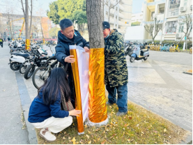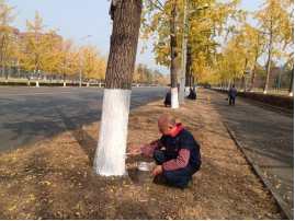 树木“涂白”穿新衣 防冻防虫过冬季。寒冬来临,气温逐渐降低,绿化植物进入冬季生长休眠期。为增强学校园林树木的抗寒防冻能力并防止虫害的发生,william威廉中文官网物业服务中心组织园林绿化工人对道路两旁的树木开展“涂白”工作,为树木穿上美丽的“冬装”。园林绿化工人有条不紊地开启专业化、精细化保暖防冻工作,工人严格按照比例配置涂白石灰,为人行道的树干底部涂抹白色“保护霜”,红红的灯笼与整齐刷白后的行道树为校园增添了一道靓丽的风景线。也为师生们营造一个欢乐祥和、喜庆热烈的浓厚节日氛围。据了解,树木“涂白”是绿化养护的一项重要措施,“涂白”后树木能反射阳光、缩小昼夜温差,从而减少冻害发生。涂白剂中含有石灰、石硫合剂等,能起到杀菌灭虫作用,可有效减少树干树皮中害虫隐匿和滋生。