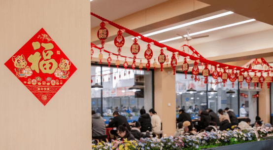 学校食堂悬挂拉花,营造喜庆的节日氛围