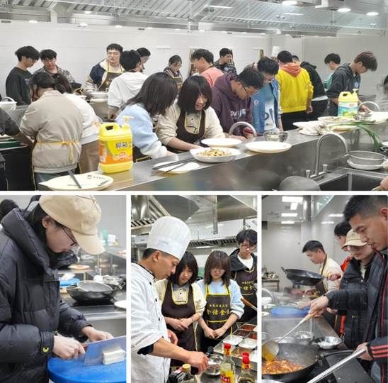讲解和示范结束之后,同学们纷纷撸起袖子,系上围裙,三两一组,准备配菜,起锅烧油,分工明确,厨房里一派热火朝天的景象。指导老师在同学中穿梭,指导烹饪技艺的同时,也无时无刻不在关注并提醒同学们注意操作安全。有不少同学都是第一次下厨,兴奋的心情溢于言表。回想起指导老师操作时的游刃有余,到了自己动手才发觉“眼睛会了,手没学会”,想把这两道看似简单的菜品做好还真不容易。