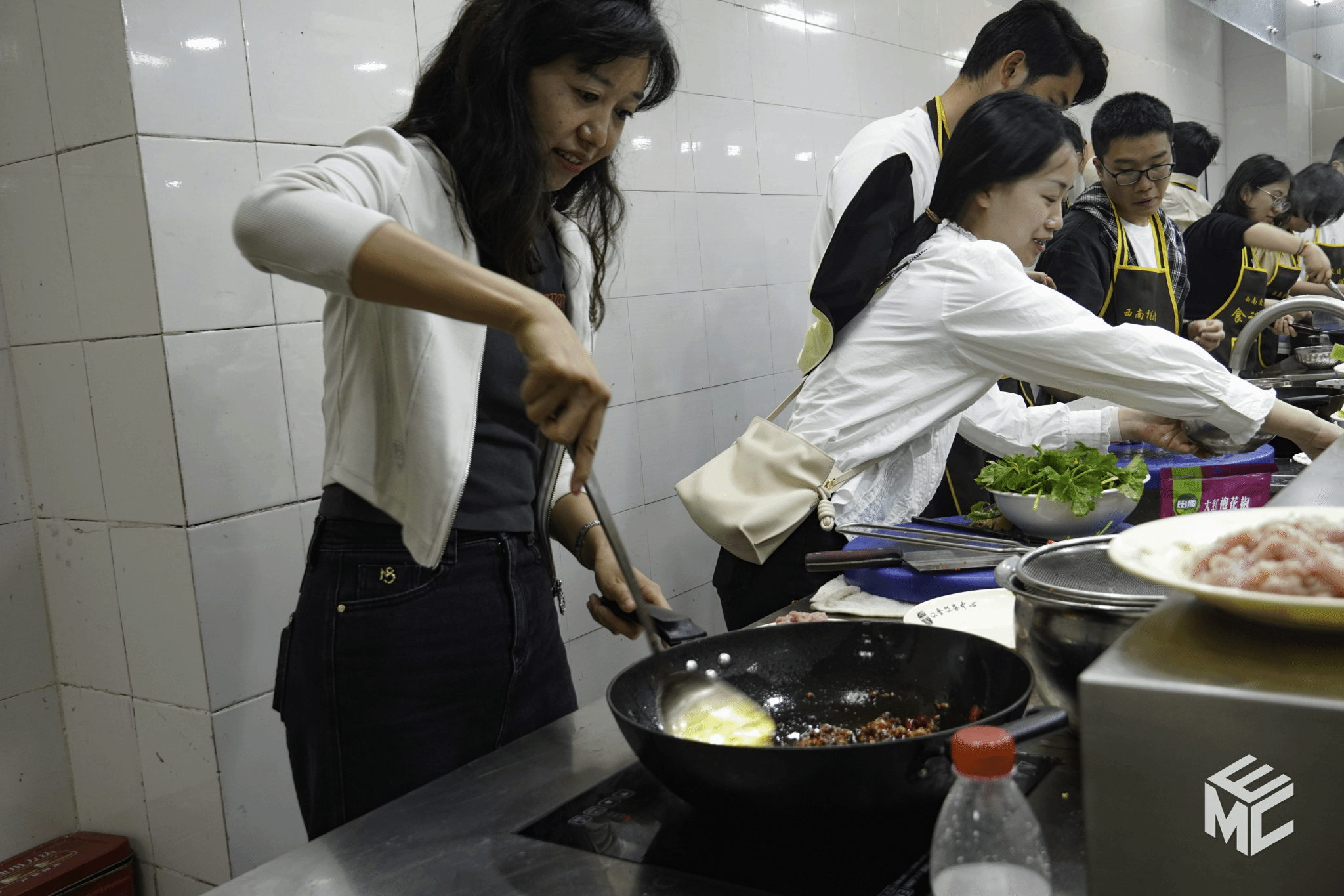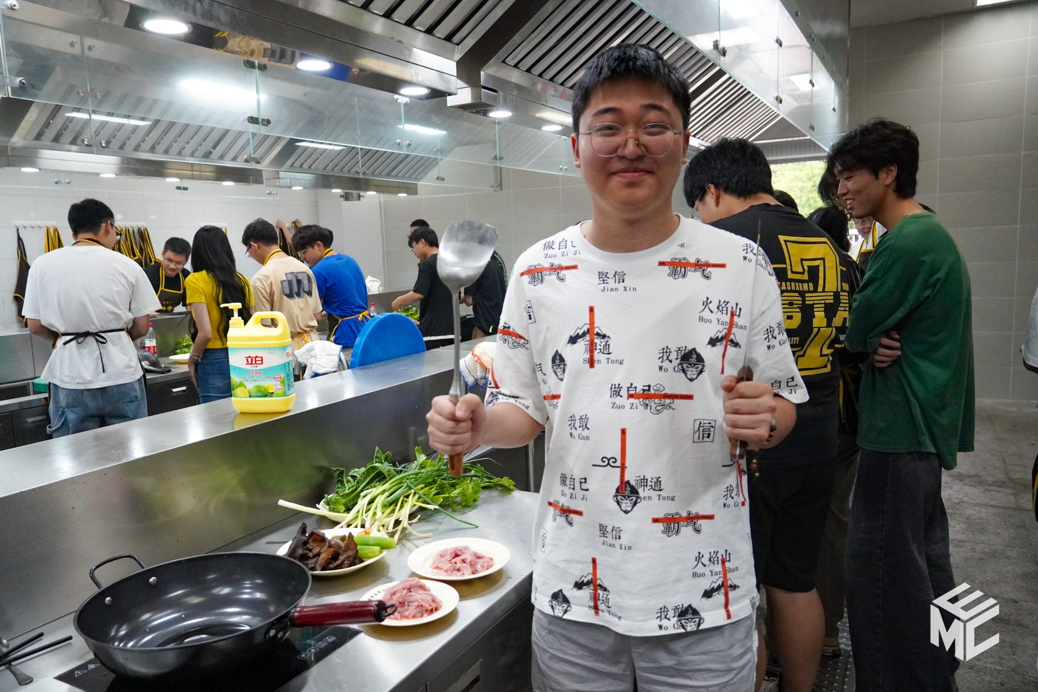 然后同学们三人一组,利用助教老师为大家准备好的食材,亲手烹饪菜肴。略显笨拙的刀法、小心翼翼地倒油……虽然大家的厨艺并不高超,但是热闹的氛围和止不住的欢声笑语展现出了同学们对于烹饪的热情。亲手烹饪的菜哪怕不完美,也依旧是一道意义非凡的美味。