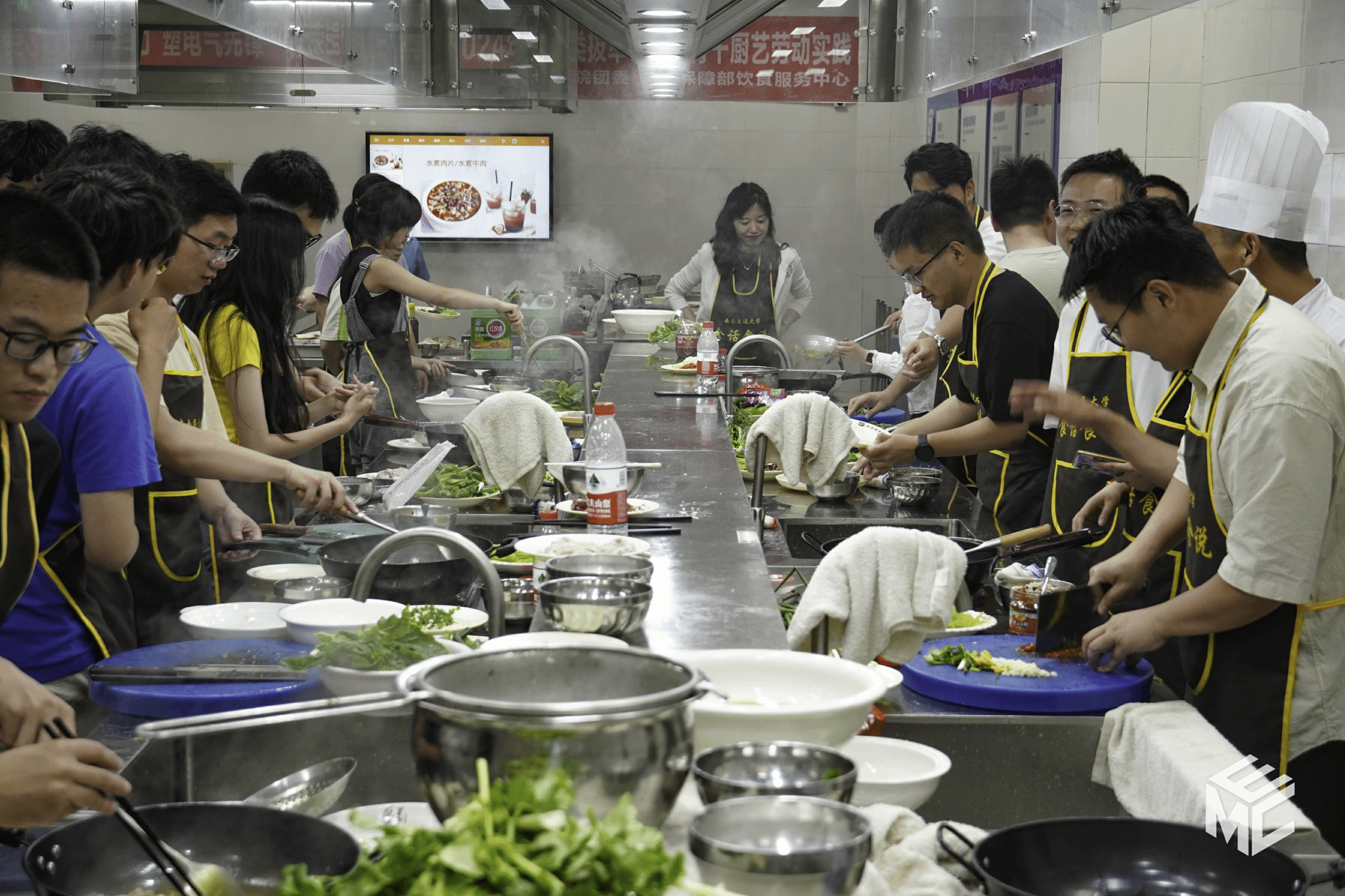 授课老师讲述鱼香肉丝和水煮肉片的历史渊源后,演示了操作过程,切肉、码味、起锅、翻炒,鱼香肉丝光润鲜香,同学们争先品尝;勾芡,炸制海椒,热油激发的香气让人欲罢不能,水煮肉片的魅力就在于那一口麻辣过瘾。老师逐步展示,同学们认真听讲,学习鱼香肉丝和水煮肉片的烹饪秘诀。