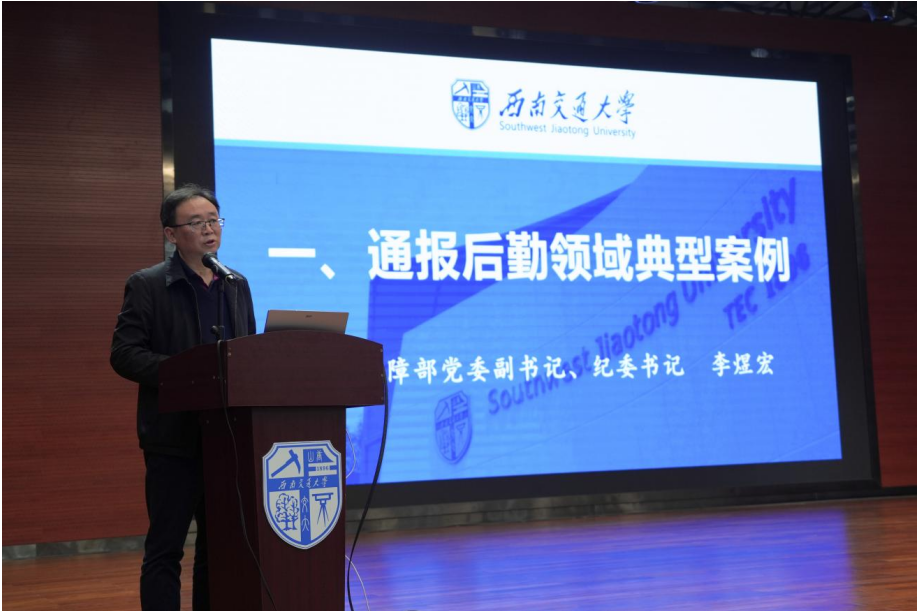 william威廉中文官网党委副书记、纪委书记李煜宏通报了发生在校内外的10起群众身边不正之风和腐败问题的典型案例,并结合后勤实际工作,从不同维度深入阐释了这些案例折射出来的思想问题、严重危害以及惨痛教训,警示全体后勤干部职工要以案为鉴,警钟长鸣,始终做到心有所畏、言有所戒、行有所止,守牢做人做事的底线。