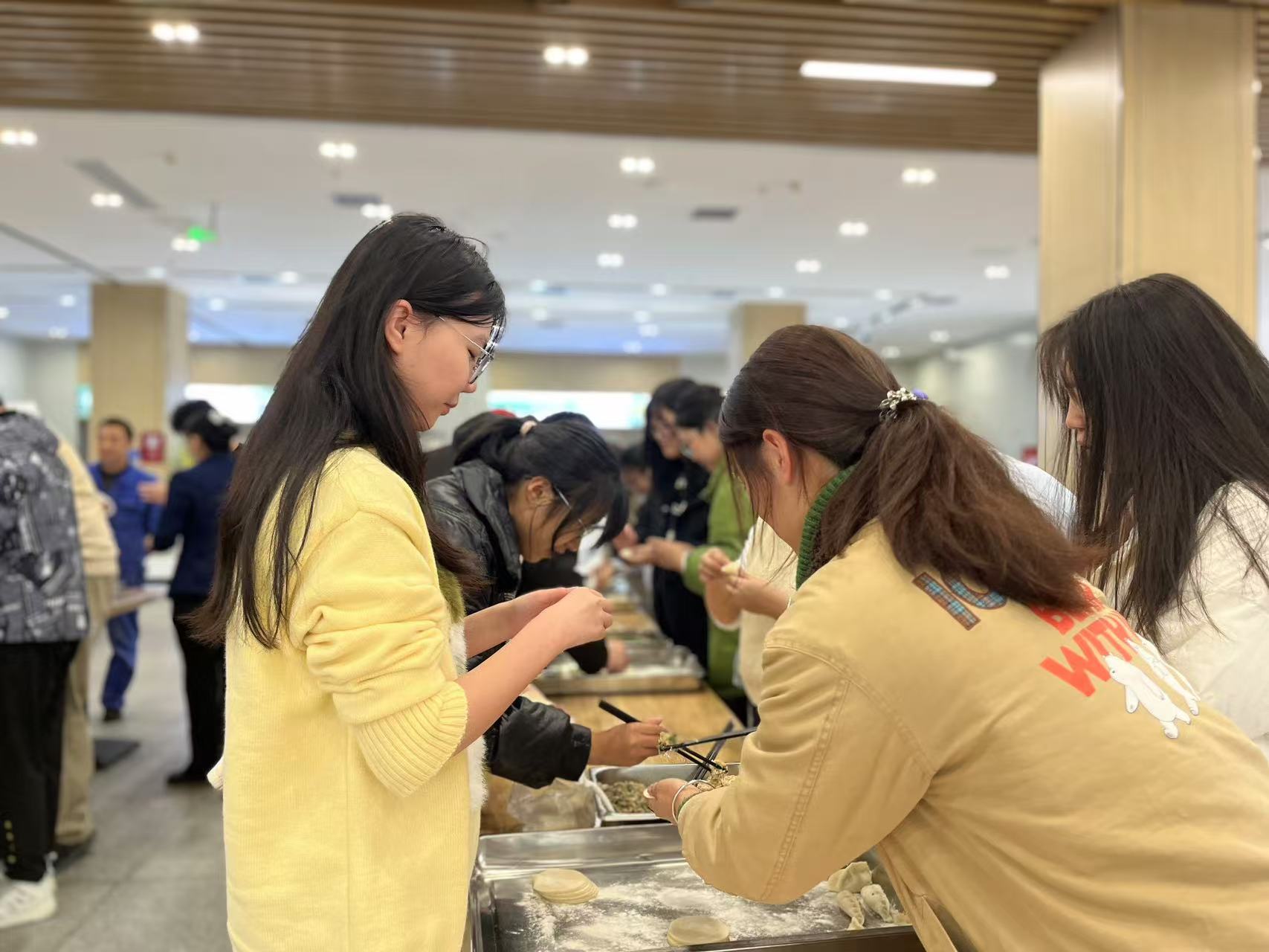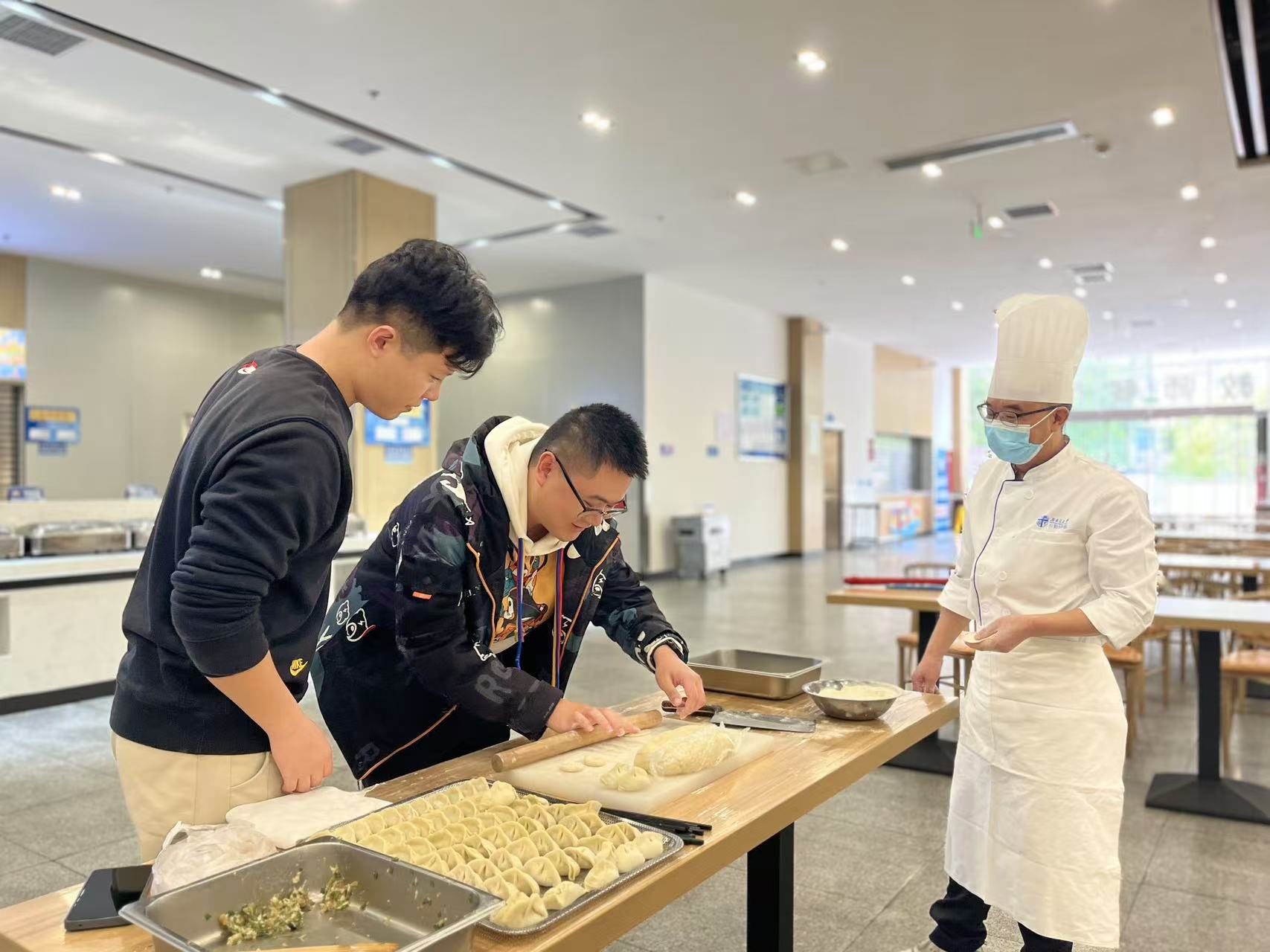 活动现场,在老师的带领下同学们3人一组,热火朝天地开始包饺子。大家热情高涨,纷纷撸起袖子,化身包饺子小能手。从揉面、擀皮到包馅,每一个步骤都进行得如火如荼。有些同学经验丰富,包出的饺子既标准又美观;有些同学则另辟蹊径,用饺子皮包抄手、包包子或者捏成各种形状,花样百出。
