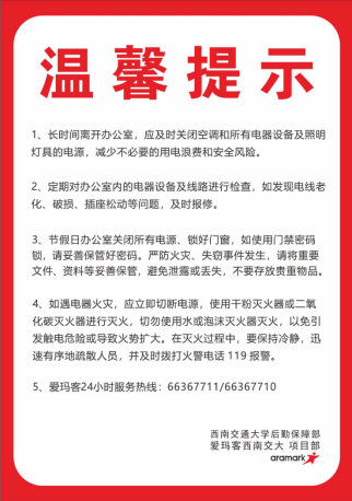 四是加强节能宣传。在机关与直属单位党委的大力支持下,假期中对科研实验以及行政办公等相关场所密切关注水电能耗使用,通过张贴节能标语、发送节能提醒等方式,提醒师生做到人走关灯、关闭相关用电设备,杜绝“长明灯”、“长流水”等水电浪费现象。