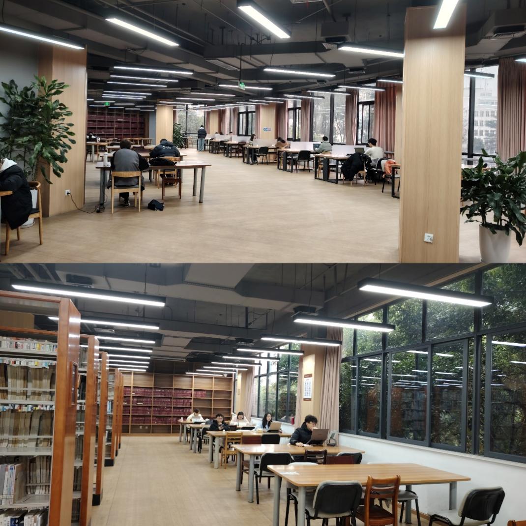 九里校区茅以升图书馆照明提升改造项目达到科技赋能、智能照明、分区定制、呵护视觉健康等目的。一是阅读自习区采用4000K暖光LED平板方形灯,减少眼部疲劳,营造放松氛围,提供师生美好阅读环境;二是书架区采用6500K中性光LED条形灯,书架区域照度提高,提高师生找书效率;三是各层不同区域实现分区控制、智能照明,达到“节能降耗”目的。