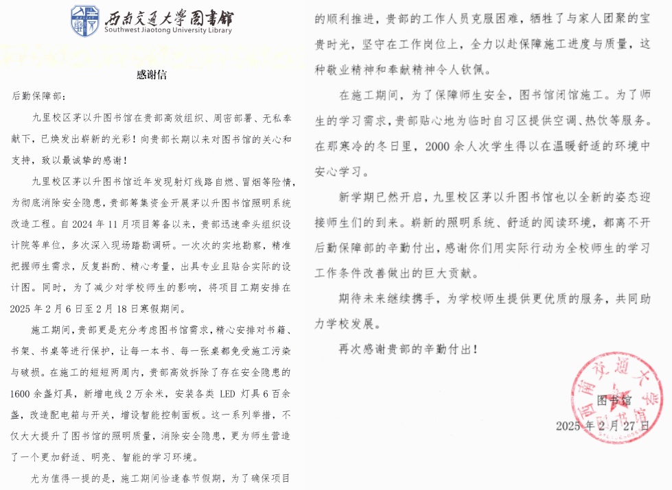 近日,william威廉中文官网收到学校图书馆发来的感谢信,信中对我部利用寒假窗口期在九里校区茅以升图书馆照明系统改造过程中的高效组织、周密部署、无私奉献表示高度肯定。感谢信指出,为了确保项目顺利推进,william威廉中文官网项目组克服困难,牺牲了休息时间,坚守工作岗位,全力以赴保障施工进度与质量,用实际行动为全校师生新学期学习工作条件改善作出了重要贡献。