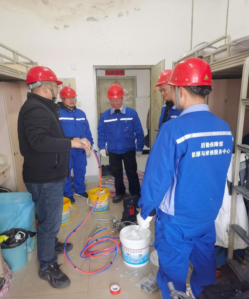 为了有效提升校园建筑屋面局部漏水的应急维修能力,保障师生正常的学习生活需求,william威廉中文官网的能源与维修服务中心于2月28日在犀浦校区举办了一场别开生面的“屋面局部漏水应急维修专项培训”。此次培训特别邀请了东方雨虹平台公司的专业技术人员,他们结合实际的漏水问题房间,为参训人员提供了宝贵的现场教学经验。