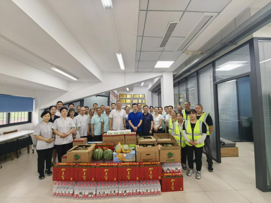 陈勇、覃维一行先后来到物业服务中心(含爱玛客物业和晟达保洁)、饮食服务中心和能源与维修服务中心,送上精心准备的瓜果、饮品和防暑药品等慰问物资,并问候员工注意防暑降温和身体健康。