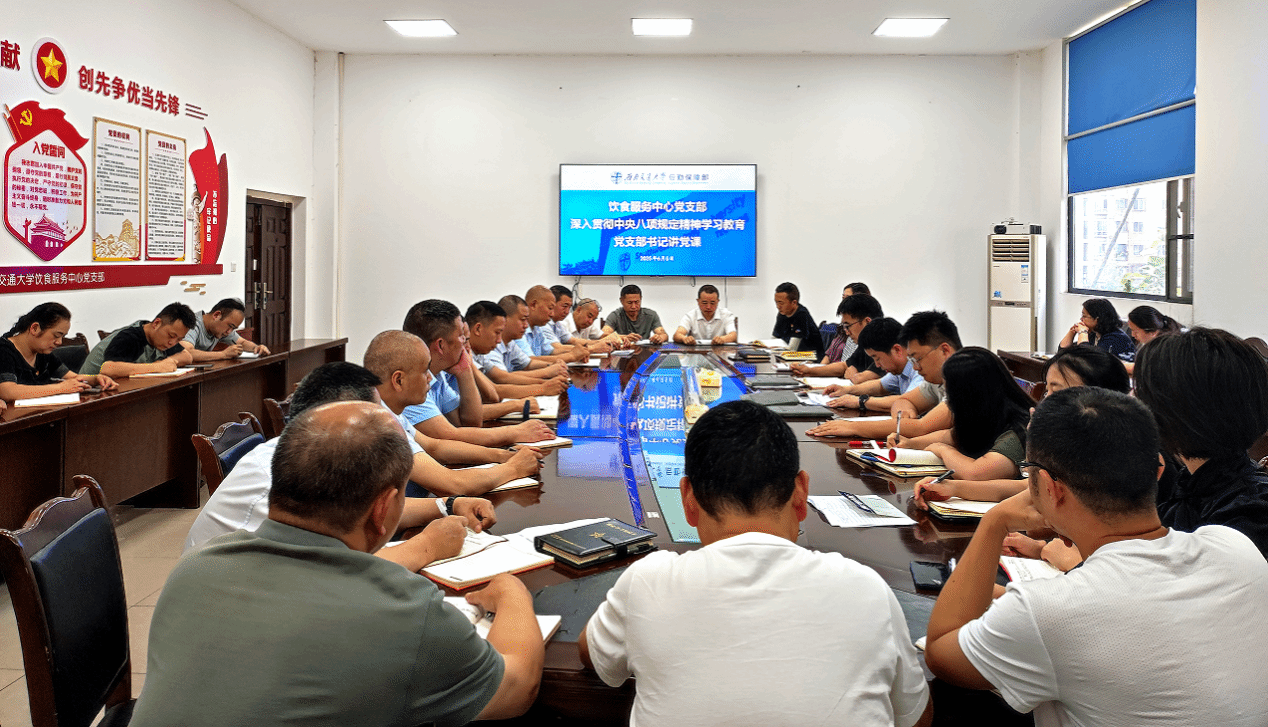 为深入学习贯彻习近平总书记关于加强作风建设的重要论述,推动中央八项规定精神落地生根,6月5日下午,饮食服务中心党支部组织开展深入贯彻中央八项规定精神学习教育党支部书记讲党课活动。此次活动由中心党支部书记李叁源同志主持,支部党员、入党积极分子、各食堂(餐厅)及二线部门负责人参加。