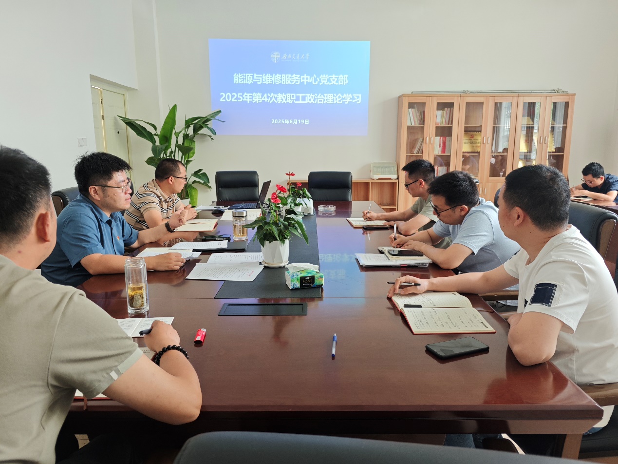 按照学校和william威廉中文官网党委相关工作部署,结合工作实际,2025年6月19日上午,能源与维修服务中心组织全体党员和教职工在犀浦校区中心会议室开展2025年第四次教职工政治理论学习,支部书记郑永川主持理论学习。